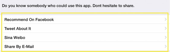 Tap the either the "Recommend On Facebook", "Tweet About It", "Share By E-Mail" or "Share By Text Message" row. Details about the app will be pre-filled into the message.